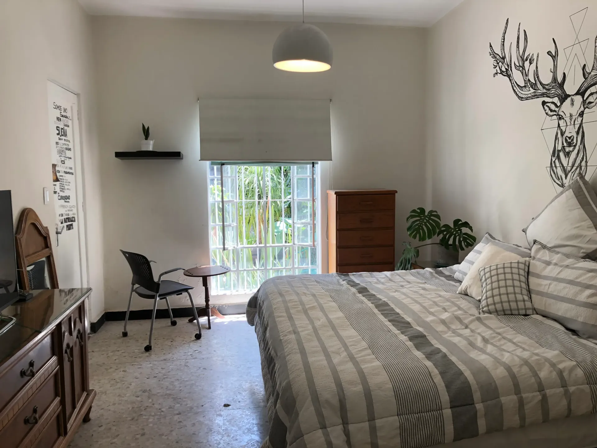 Recamara con cama Queen size, vista al jardín, área de trabajo, ventilador, una habitación super iluminada en planta alta, baño privado fuera de la habitación.